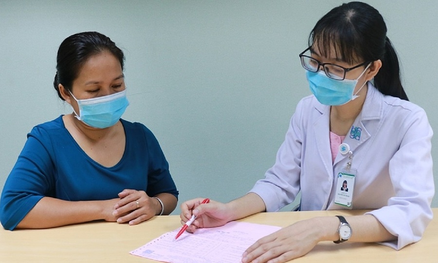 Dược sĩ Nguyễn Thị Trang (phải) tư vấn cho bệnh nhân sử dụng thuốc. Ảnh do bệnh viện cung cấp.