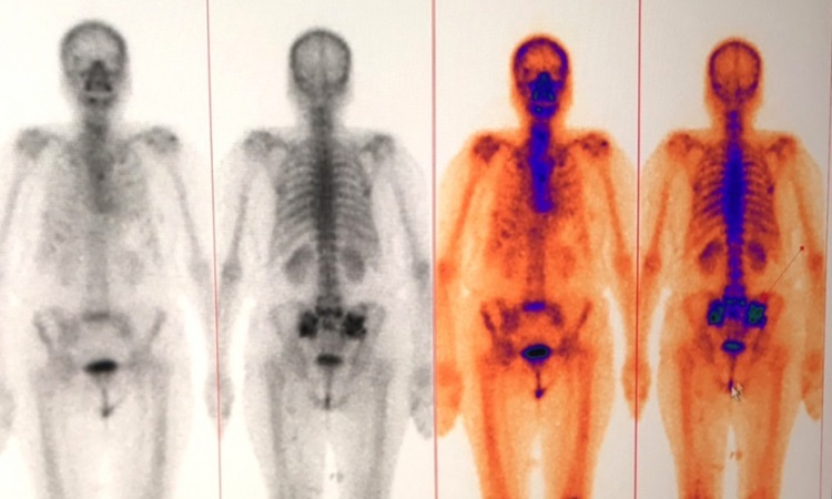 Một bệnh nhân 78 tuổi khác bị ung thư cổ tử cung được xạ trị. Kết quả chụp chiếu xương tại Bệnh viện Bãi Cháy cho thấy đã di căn xương chậu, bệnh nhân được xạ trị vùng chậu và tiêu xương. Hiện nay, công nghệ xạ hình xương có thể đánh giá được 60 trường hợp ung thư xương di căn trên bệnh nhân ung thư đầu cổ, ung thư phổi, ung thư cổ tử cung. Đây là phương pháp chính. Công nghệ y học hạt nhân hiện đại. Thế giới .—— Ảnh chụp xương của bệnh nhân ung thư trong bệnh viện. Ảnh: Mạc Thảo