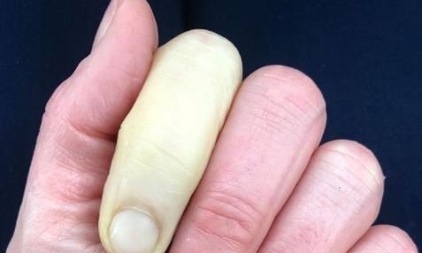 Jenni Falconer là một nữ MC nổi tiếng ở Anh. Cô vừa chia sẻ hình ảnh bàn tay lạ trên trang cá nhân khiến nhiều người bất ngờ. Bức ảnh cho thấy một ngón tay có màu trắng, khác hẳn các ngón khác do ảnh hưởng đến quá trình lưu thông máu.