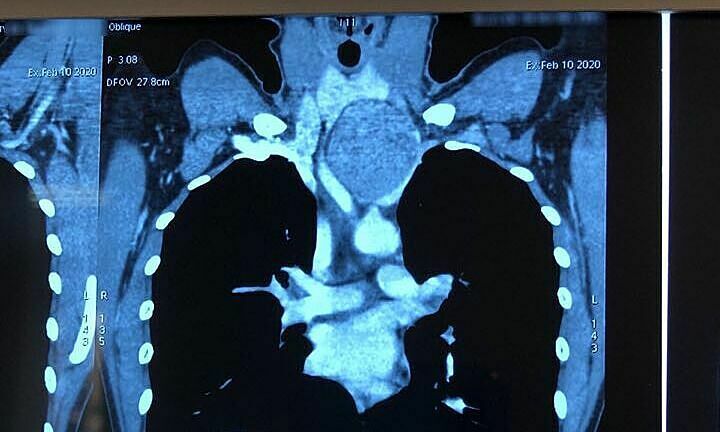 Trong kiểm tra sơ bộ, bác sĩ nghi ngờ bệnh nhân đã để lại khối u tuyến giáp. Bệnh nhân được chụp cắt lớp 64 giờ và sinh thiết bằng kim. Kết quả chẩn đoán hình ảnh và chẩn đoán được xác định là khối u tuyến ức loại AB của trung thất trước và phần cổ trái. Khối u dài 8x5cm và còn được gọi là tuyến ức ngoài tử cung.