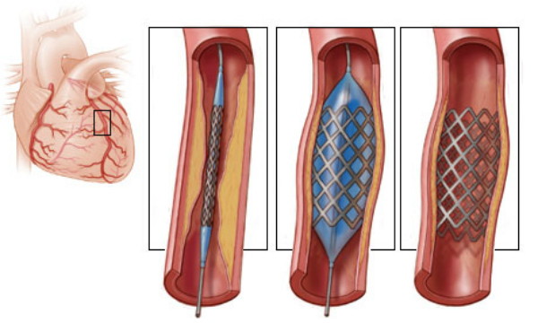 Một ống thông nhỏ có bóng và stent kim loại được đưa từ cổ tay qua động mạch đùi hoặc động mạch quay vào động mạch vành của bệnh nhân. Sau khi đến chỗ tắc nghẽn, bóng được bơm căng để mở rộng lòng mạch và đưa vào trong stent kim loại để duy trì lưu lượng máu.