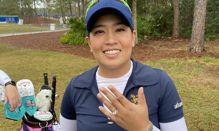 Suwannapura đã khoe chiếc nhẫn cầu hôn của bạn trai tại giải đấu vô địch. Ảnh: Golfweek – trận đấu mở màn của giải vô địch hạng áp chót-LPGA Tour. Cô ấy không đeo nhẫn đính hôn và chơi 69. Suwannapura giải thích: “Tôi không muốn mất nó.”