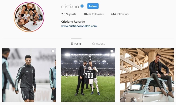Ronaldo hiện là cầu thủ được theo dõi nhiều nhất trên Instagram. 186 triệu, vậy là nhờ mạng xã hội này mà anh ấy cũng trở thành người kiếm được nhiều tiền nhất, năm 2019 đã xuất bản 49 quảng cáo, mỗi quảng cáo có giá ước tính là 976.000 đô la Mỹ, và doanh thu xấp xỉ 48 triệu đô la Mỹ. Đây là vị trí thứ hai Lionel Messi (Lionel Messi) nhiều hơn hai lần.