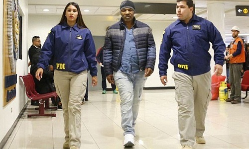 Truyền thông Chile đưa tin Tyson bị hải quan địa phương bắt giữ, từ chối nhập cảnh và phải quay trở lại Mỹ. Nguyên nhân là do anh ta bị kết tội hiếp dâm, hành hung và tàng trữ cocaine. Cảnh sát San Diego cho biết Tyson bị trục xuất vì “không tuân thủ luật nhập cư”. Cảnh sát Chile hộ tống Tyson khỏi sân bay Santiago. Ảnh: AP .