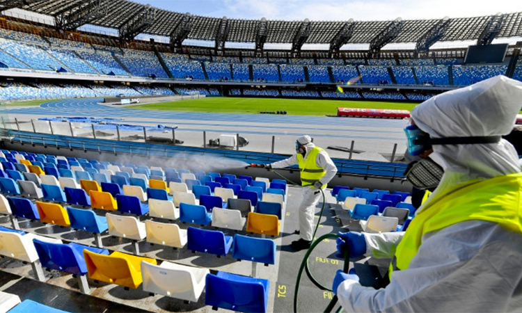 Vào ngày 9 tháng 3, các nhà dịch tễ học đã phun thuốc và khử trùng sân bóng Serie A cho đến khi CONI quyết định dừng mọi hoạt động thể thao. Ảnh: ANSA .