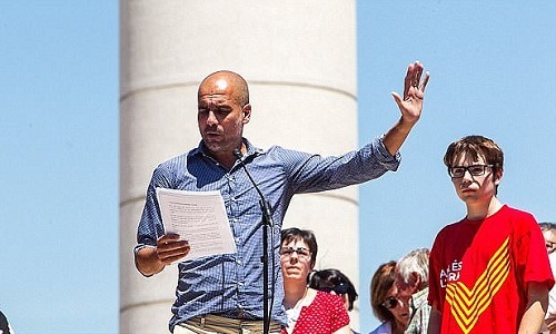 Guardiola đọc một tuyên bố ủng hộ độc lập tại cuộc biểu tình ngày 11 tháng Sáu. Theo National News, cảnh sát Tây Ban Nha tin rằng huấn luyện viên của Manchester City Man là một trong những người nổi dậy của phe Hồi giáo của phong trào độc lập xứ Catalan và cần được điều tra. Nhiếp ảnh: Rex