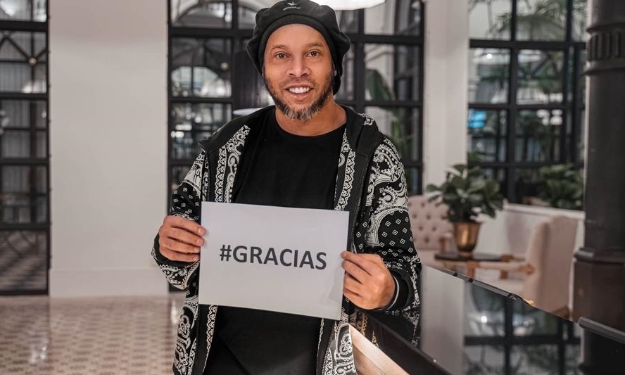 Ronaldinho hiện đang bị quản thúc tại khách sạn. Anh ta giơ biển hiệu Tây Ban Nha, có nghĩa là “cảm ơn.” Ảnh: Elisa Kawata